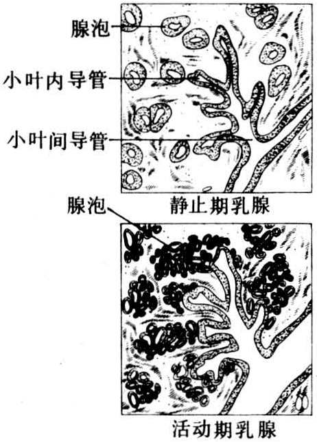 乳腺为复管泡状腺,由分泌部和导管部组成(图2)。①分泌部由腺泡构成。腺上皮为单层,细胞的形状随分泌周期而变化,当细胞内蓄积分泌物时呈高柱状或锥形,腺泡腔较小;随分泌物的排出,细胞变成低立方形或扁平状,腺泡腔较大,充满分泌物。在腺上皮与基膜之间有肌上皮细胞,该细胞的收缩有助于乳汁的排出。乳腺的结构一直处在变化过程中,主要表现为腺体分泌部的新生或吸收,静止期的乳腺腺泡减少而塌陷,结缔组织和脂肪组织增多,至妊娠期腺泡迅速增生,腺泡腔增大,结缔组织和脂肪组织逐渐减少。在泌乳期腺泡处于不同分泌周期,腺泡腔中充满乳汁,结缔组织显著减少,已无脂肪组织。老龄母畜乳腺退化,由结缔组织和脂肪组织取代。②导管部的导管很发达,与腺泡相连的为小叶内导管,管壁衬以单层立方上皮。小叶内导管在小叶间结缔组织内汇入小叶间导管,管壁衬以单层柱状或双层立方状上皮,小叶间导管集合至大的输乳管。输乳管及乳窦的管壁为双层立方状上皮,乳头管的管壁为复层扁平上皮。(谢念难)