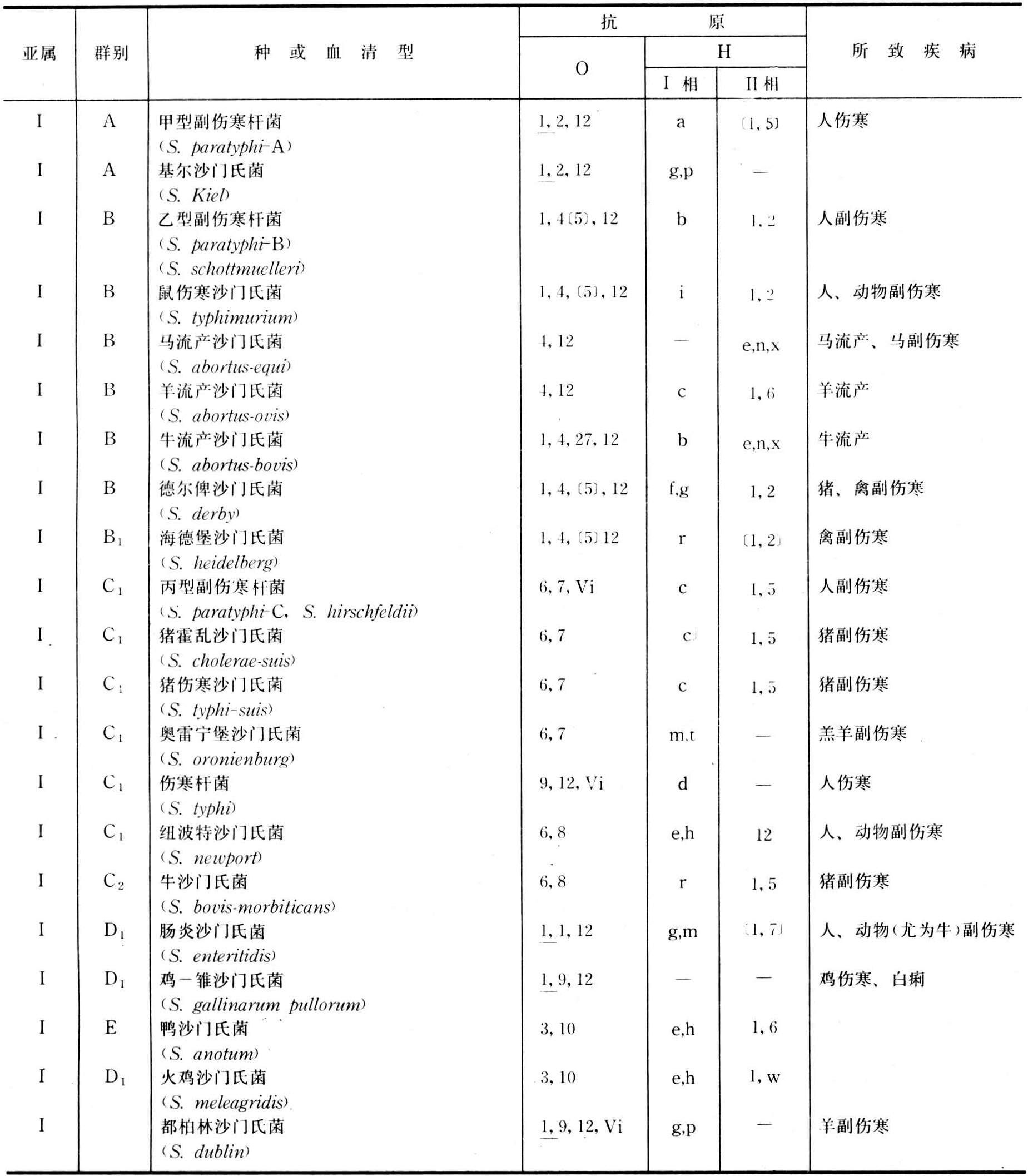 该属细菌以菌体抗原(O)和鞭毛抗原(H)进行分群和分型,已发现2000多型。多数是动物致病菌,也有人畜共同致病菌,所致人类及动物疾病主要特征是肠热症、败血症和胃肠炎。根据该属细菌的某些重要生化特征差异,可将其分为五个“亚属”。
