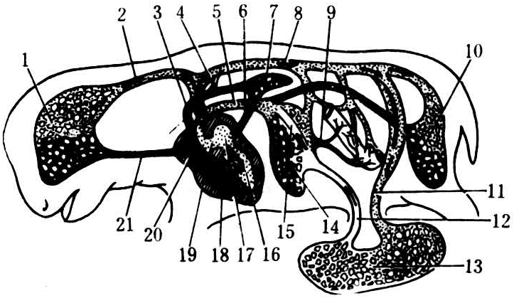 胎儿经胎盘与母体进行物质交换的血液循环过程。胎盘的动脉血,经脐静脉进入胎儿体内,经肝脏窦状隙与门静脉的静脉血混合(牛、犬部分血液经静脉导管到后腔静脉),然后集合成数条肝静脉。入后腔静脉,与来自身体后半部的静脉血混合,注入右心房。大部分血液经房间隔上的卵圆孔,流入左心房,再经左心室到主动脉及其分支,大部分血液到头部和前肢。来自胎儿躯体前半部的静脉血,经前腔静脉入右心房,再经右心室入肺动脉。