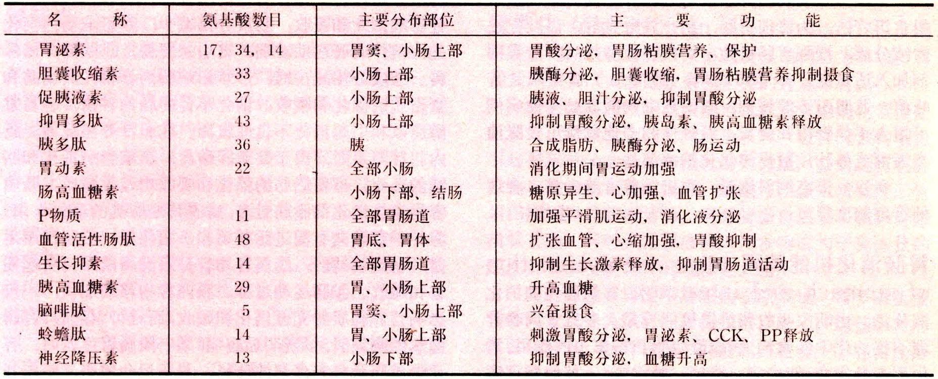 散在于胃肠道粘膜上皮细胞间的内分泌细胞所产生的生物活性物质。胃肠激素调节胃肠的运动和吸收以及消化腺的分泌,并对消化道组织有营养和保护作用。胃肠激素均属多肽,分子量在2000~5000之间。现已确认的胃肠多肽已有30多种,但是除胃泌素、促胰液素、胆囊收缩素和抑胃多肽4种外,其余的胃肠多肽在化学结构、生理功能等方面,有待进一步澄清。后者又称为胃肠“候补激素”。主要的胃肠激素和候补激素见表。
