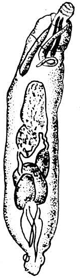 鸭细颈棘头虫寄生于鸭、鹅、天鹅和一些种野生水禽小肠引起的寄生虫病。鸭细颈棘头虫〔Filicolis anatis(Schrank,1788)〕属棘吻目、细颈科、细颈属。虫体呈纺锤形,白色,前部有小棘。雄虫大小为(4~6)×(1.5~2)毫米,吻突呈椭圆形,具有18列小钩,每列10~16个(图)。吻腺长,睾丸位于虫体前半部,前后排列。睾丸下方有6个呈椭圆形的粘液腺。雌虫大小为(10~25)×4毫米,前部和后部稍狭小,吻突膨大呈球形,直径约2~3毫米,其前端有18列小钩,每列10~11个,呈星芒状排列。吻腺长。卵呈椭圆形,大小为(62~70)×(20~25)微米。发育过程中需栉水虱为中间宿主。致病作用、诊断和治疗见鸭多形棘头虫病。(林昆华)