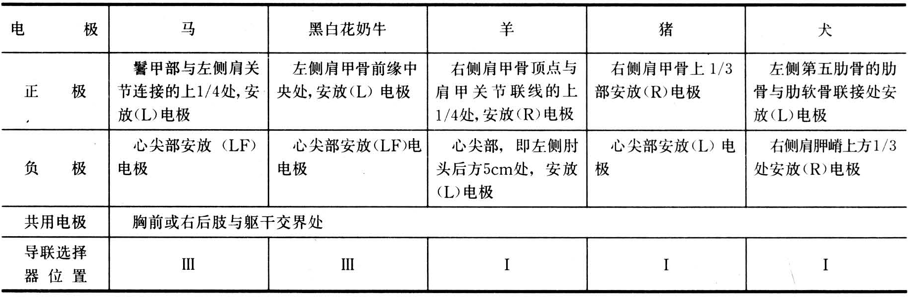 在动物体表不同部位放置电极,用于记录心电图的电路连接方法(也称导程)。各种心电图机的导联线均以红(R)、黄(L)、绿(LF)、黑(RF)及白(C)等不同颜色标记以区分正负电极。临床上常用的导联有:①双极肢导联。又叫标准导联。其具体连接方式有以下几种,第一导联(L1),正极接于左前肢,连接黄色(L)导线,负极接于右前肢,连接红色(R)导线。第二导联(LⅡ),正极接于左后肢,连接绿色(LF)导线,负极接于右前肢,连接红色(R)导线。第三导联(LⅢ),正极接于左后肢,连接绿色(LF)导线,负极接于左前肢,连接黄色(L)导线。双极心尖—心基导联(A—B导联),也是兽医临床常用的一种双极导联,是在动物的鬐甲部、心区部、前胸或右后肢部位安放电极,其图形具有振幅较高、易于分析和测量等优点,马、牛、羊及猪A—B导联具体部位见表。②单极导联。由于标准导联所记录的心电变化只能反映体表两点间的电位差,不能测得某一点的电位高低。临床上常用的单极导联有加压单极肢体导联和单极胸导联二类。加压单极肢体导联分为加压单极右前肢导联(aVR)、加压单极左前肢导联(aVL)和加压单极左后肢导联(aVF)等三种。