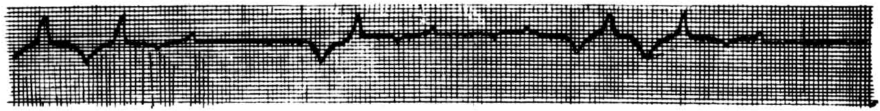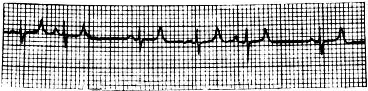 其心电图特点是P—P或R—R间期长短不等,主要由于T—P间期不等所致。在同一导联上,最大的R—R间期与最小的R—R间期差别在0.12秒以上,排除某些生理因素(异常刺激,高度兴奋等)常见于仔猪、羔羊缺硒病(如图3)。