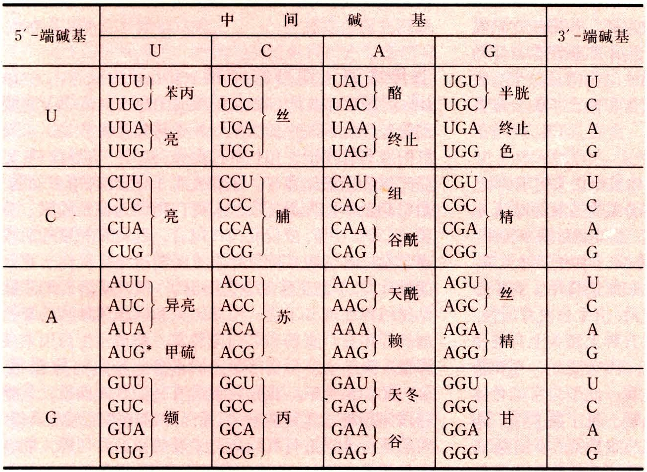 编码蛋白质中氨基酸顺序的脱氧核糖核酸(DNA)的核苷酸顺序。生物的遗传信息储存在DNA的核苷酸顺序中,经过转录后转抄在信使RNA(mRNA)的核苷酸顺序中,由mRNA指导蛋白质的合成。每个氨基酸都由mRNA中三个相邻的核苷酸碱基组成的三联体编码,称为密码子。如表中所示UUU是苯丙氨酸的密码子。四种碱基可组合成43=64个不同的密码子。其中3个(UAA、UAG和UGA)称终止密码子,它们是使翻译终止的信号,不编码任何氨基酸。其余61个密码子是编码20种氨基酸的。因此,大多数氨基酸都有2个以上的密码子编码。如GAA、GAG都是谷氨酸的密码子,为甘氨酸编码的有4个密码子。这种现象称密码子的简并性。在原核生物中有两个密码子(AUG、GUG)具有双重作用。它们位于mRNA翻译的起始部位时称起始密码子,翻译由它们开始。AUG是常用的起始密码子,GUG偶尔出现。它们作为起始密码子时编码甲酰甲硫氨酸。AUG、GUG处于mRNA链内部时又分别作为甲硫氨酸和缬氨酸的密码子。在真核生物中起始密码子AUG代表甲硫氨酸。密码子之间没有标点。阅读密码子从起始密码子开始,按mRNA的5′→3′方向不重叠地连续地进行,直至终止密码子为止。天然mRNA都有起始和终止密码子,它们决定翻译的起始点和终止点。氨基酸的这套密码子对几乎所有生物都是共同的,这为生物界的共同起源学说提供了有力依据,也是当前遗传工程中能将一种生物的基因转移到另一种生物中去表达的原因。近年来发现在人和牛线粒体中遗传密码子出现三处例外:UGA由终止信号变为色氨酸密码子;AGA和AGG由精氨酸的密码子变为终止信号;AUA由异亮氨酸变为甲硫氨酸的密码子。