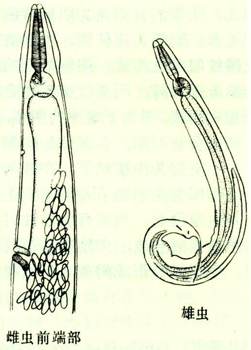 隐匿管状线虫寄生于大鼠和小鼠盲肠引起的寄生虫病。隐匿管状线虫〔Syphacia obvelata(Rudolphi,1802)〕属尖尾目、管状科、管状属。是各种鼠类最常见的线虫之一,仓鼠、家鼠和田鼠也常被感染,猴有易感性,人也有被感染的报告。虫体白色,有光泽。口孔周围有三片唇,无口囊。食道有两个膨大球,有窄的侧翼。雄虫长1.1~1.5毫米,尾向腹面弯曲,泄殖腔后急剧变细,泄殖腔附近的腹面有3个角皮突出物,两个伸向侧部,中间的一个在虫体中央,有一细长的交合刺和一引器带(图)。雌虫长3.4~5.8毫米,阴门位于虫体前1/6处。虫卵一边较平直,大小为(118~153)×(33~55)微米。发育史属直接型。雌虫在肛门周围产卵,卵经数小时发育为感染性虫卵,经两个途径感染宿主:①宿主直接吞食了感染性虫卵;②虫卵在肛门周围孵化,幼虫由肛门爬入结肠内。一般感染无临床症状,严重感染时影响增重和生长发育或引起肠机能紊乱。从鼠粪便中或肛门周围发现虫卵或从盲肠和结肠中发现成虫即可确诊。可用哌哔嗪驱虫。(林昆华)