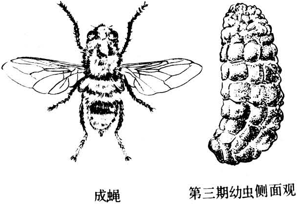 麻蝇、污蝇、丽蝇、绿蝇等蝇类中一些种类的幼虫寄生于家畜伤口组织中引起的一种病害。中国各地常能见到,特别是管理粗放的牧区羊群,尤为严重多见,造成一定的损害。成虫营独立生活,属于双翅目、环裂亚目的有瓣蝇组,其中麻蝇属(Sarcophaga)多为灰黑色,胸部背面有三条黑色纵纹,腹部有黑白相间的棋盘格状斑块;污蝇属(Wohlfohrtia)多为灰白色,胸部背面也有三条黑色纵纹,腹部灰色的底面上有黑色斑点;丽蝇属(Calliphora)、绿蝇属(Lucilia)多为有金属色泽的蝇子,前者多为深暗的蓝绿色,身上毛刺较多,后者多为明亮的铜绿色,毛刺较少。这些蝇类,多半形体较大,飞翔力很强,能远离幼虫的孳生地;发育过程为完全变态,有的卵生,有的胎生。幼虫俗称蛆,有三期,大部分兼性寄生,少部分专性寄生;在伤口组织中发育成长后落地化蛹,幼虫期和蛹期的长短均因种类、气候条件及营养获得等的情况而异,条件合适时,有的仅需几天时间。成蝇寿命1~2月,炎热季节常可繁殖几个世代。