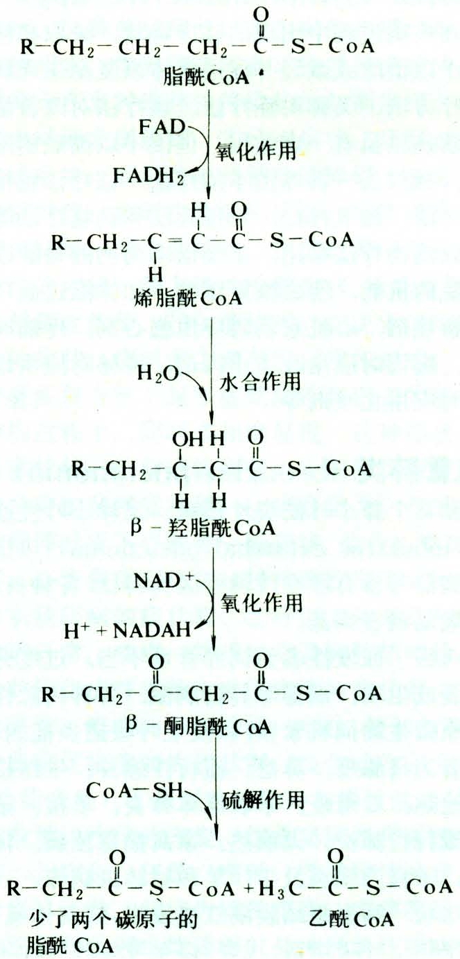 脂肪酸首先由泡液中的酶催化与腺苷三磷酸(ATP)、辅酶A反应生成脂酰辅酶A,然后进入线粒体进行分解。在线粒体内酶系的催化下,脂酰辅酶A在α、β-碳原子处经过脱氢、水合、再脱氢及硫解等反应(图),生成1分子乙酰辅酶A和б原来少两个碳原子的脂酰辅酶A。此脂酰辅酶A重复上述反应,每次脱去1分子乙酰辅酶A,直至最后全部变成乙酰辅酶A为止。由于上述过程中的脱氢反应均发生在脂酰辅酶A的β-碳原子处,所以称为β-氧化作用。体内的脂肪酸除主要经β-氧化作用外,也有少量按ω-氧化及α-氧化等方式氧化分解。
