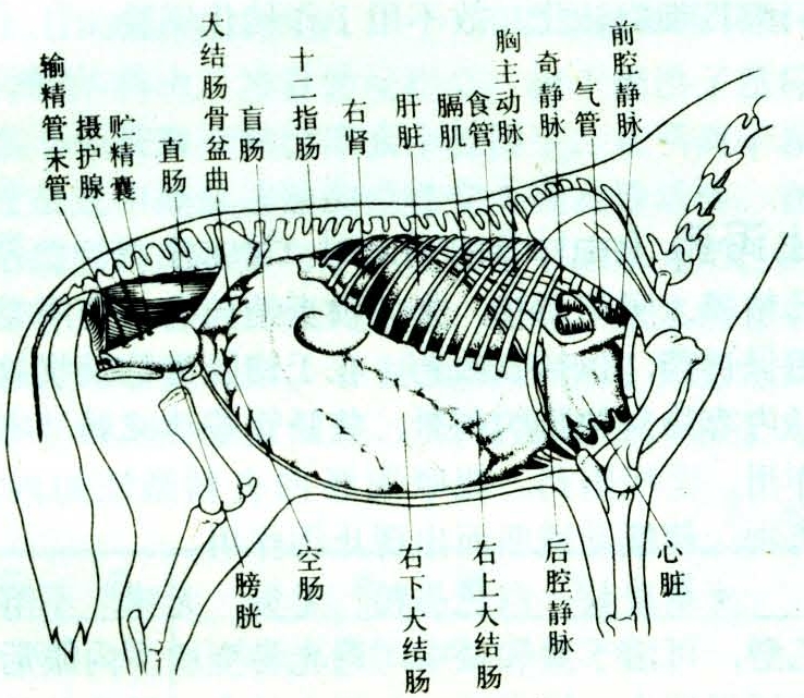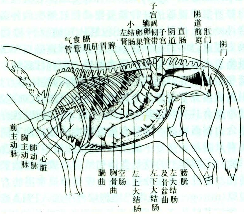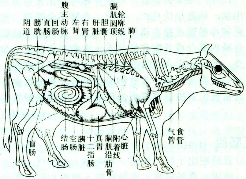 膀胱的病变等。马的内脏器官位置见图1、图2。牛直肠检查 柱栏保定,助手加鼻钳,必要时后肢用绳环套住。术者将手作成锥状,旋转插进肛门,掏出直肠内蓄粪,手伸入结肠的最后段即可进行触摸,顺序为盆腔右侧脏器→左侧脏器→肾及腹主动脉等。