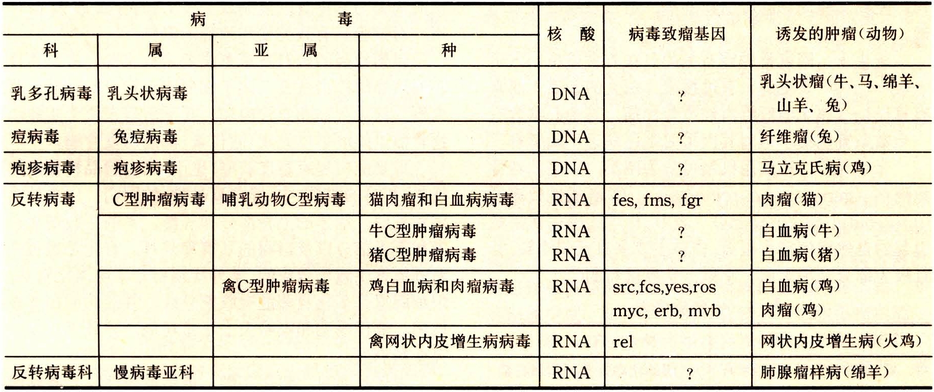 19世纪末人的乳头状瘤病毒被发现后,20世纪初,鸡的成红细胞性白血病和鸡的肉瘤相继被证明也是由病毒所致。在畜禽,明确的病毒—肿瘤宿主系统已增加到15个(表2)。
