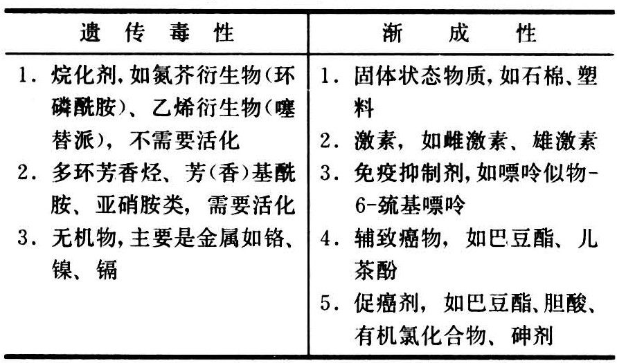 所谓遗传毒性是指对生殖细胞和体细胞的核内和核外遗传物质具有毒性、致死性并引起可遗传的变化。所谓渐成性是指同DNA以外的巨分子相互作用。遗传毒性致癌剂都属于亲电子反应物(electrophilic reac-tant),许多能以共价键(即共用电子对)同细胞里的亲核物(cellular nucleophile),如DNA的4个碱基和磷酸二酯骨架结合,形成共价加合物(covalent adduct,指两种物质通过共用电子在化学加成反应后的产物),其中反应性最大的是嘌呤N。亚硝胺在烷化鸟嘌呤时所选择的位点主要是7位N,其次才是6位O。并芘的作用位点则为2位N。2-乙酰氨基芴则有2个位点,一为2位N,另一为8位C。氮芥会在DNA的双股之间或在一股之内造成交叉联接。