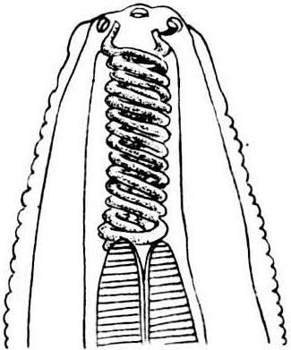 似蛔线虫寄生于猪胃内引起的以胃炎症状为特征的寄生虫病。似蛔线虫属(A sca-rops)属旋尾目、似蛔科。有两个种:①圆形似蛔线虫(A.strongylina Rudolphi,1819)。又称螺咽胃虫。淡红色。唇小,咽壁上有三或四叠螺旋形角质增厚。左侧有颈翼膜(图)。雄虫长10~15毫米,尾翼膜右大左小,有两恨不等长的交合刺。雌虫长16~22毫米,阴门位于虫体中部稍前方。卵深黄色,壳厚,外膜不平滑,两端有似小活塞状物,内含幼虫。②有齿似蛔线虫(A.dentata von Linstow,1904)。又称有齿螺咽线虫。形态与圆形似蛔线虫相似。雄虫长约25毫米,雌虫长约55毫米。口腔前部有一对齿。发育过程中以食粪甲虫为中间宿主。猪吞食了含感染幼虫的食粪甲虫而被感染。症状、诊断和防治见猪泡首线虫病。
