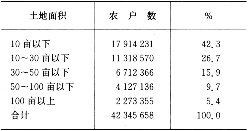 家庭是近代中国土地经营的基本单位。除经营地主、富农和带有资本主义性质的农场外,家庭成员是主要的劳力来源,使用雇工的农户和每一农户使用的雇工数量很少。因此,土地的经营规模直接受到家庭劳力的局限。由于资金短缺,农业技术落后,加上人口稠密,人均和户均耕地面积狭小,即使家庭劳力也大多得不到充分利用,结果造成了土地经营规模的普遍狭小。据1934年对关内22省891县的调查,农户经营面积在10亩以下的占35.8%,10~20亩的占25.2%,两项合计为61.0%。20亩以上的只占39%。云南、浙江、福建、广东、广西等省区,半数以上农户的经营面积不足10亩。近代后期,由于人口增加和农民日益贫困,农户土地经营规模有进一步缩小的趋势。每一农户耕作的地块,也极其分散零碎。据1933年对16省的调查统计,每块耕地的面积,平均旱地为2.995亩,水田为1.254亩。