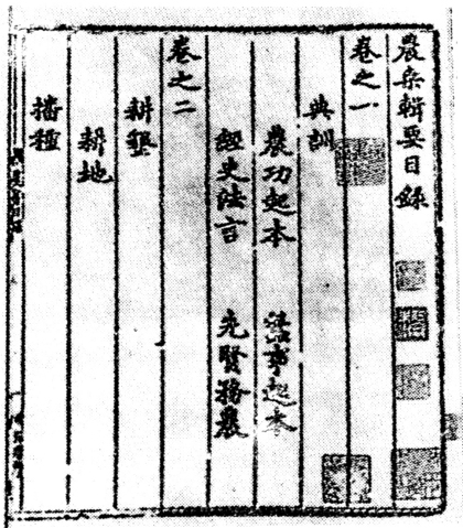 元刻《农桑辑要》书影 元代官纂的以黄河流域为主体,兼及南方农业生产的综合性农书。元代大司农司编纂。具体负责的人,一说是,一说是。一般认为孟祺是至元十年(1273)完成初稿时的主要负责人,畅师文是至元二十三年完成修订工作并把书稿献给朝廷的人。从传本中三四两卷多处及第五卷两处小字注文批文推测,重刻时很可能有过增补。