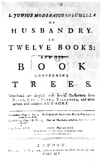 《农业论》英文译本书影 罗马奴隶制衰落时期有关农业生产及管理的著作。作者科路美拉(Lucius Junius Moderatus Columella)是罗马化的西班牙人。公元1世纪生于加的斯附近,从其父继承了在西班牙及意大利的庄园,曾参与经营管理,并从事农牧业研究。后来充任军职,遍迹地中海沿岸各地。该书是他定居罗马后于公元60年前后写成的,全书共十二卷(见图)。