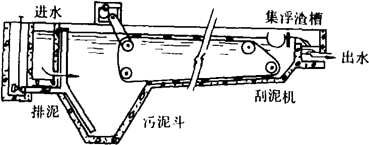 由进、出水口,水流部分和污泥斗三部分组成(图1)。池体平面为矩形,进水口设在池长的一端,一般采用淹没进水孔,水由进水渠通过均匀分布的进水孔流入池体,进水孔后设有挡板,使水流均匀地分布在整个池宽的横断面。沉淀池的出口设在池长的另一端,多采用溢流堰,以保证沉淀后的澄清水沿池宽均匀地流入出水渠。堰前设浮渣槽和挡板以截留水面浮渣。水流部分是池的主体。池宽和池深要保证水流沿池的过水断面布水均匀,依设计流速缓慢而稳定地流过。通常,池的长宽比不小于4,池的有效水深不超过3米。污泥斗用以积聚沉淀的污泥,多设在池前部的池底以下,斗底有排泥管,定期排泥。平流式沉淀池多用混凝土筑造,也可用砖石结构,或用砖石衬砌的土池。平流式沉淀池构造简单,沉淀效果好,工作性能稳定,使用广泛,但占地面积较大。若加设刮泥机,或对比重较大沉渣采用机械排除,可提高沉淀池工作效率。