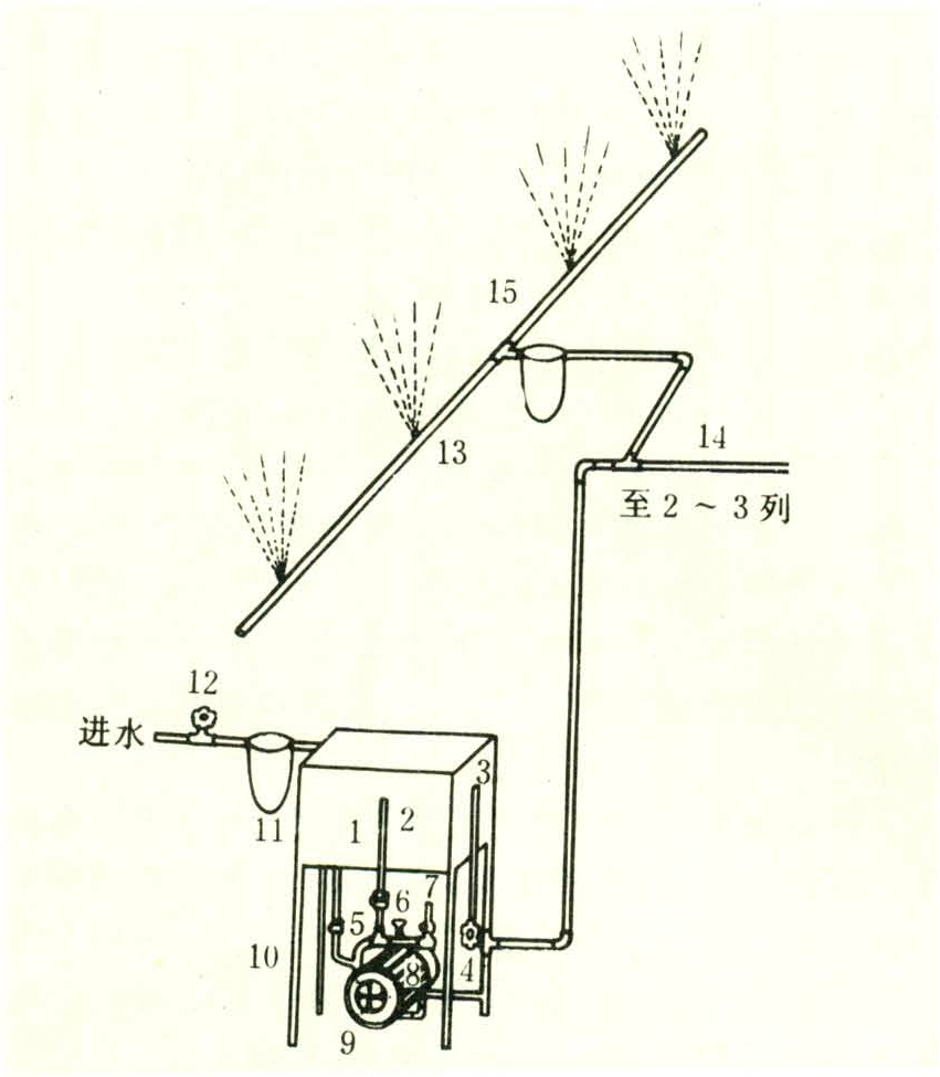 降温设备由水箱、水泵、过滤器、喷头、管路及自动控制器件等组成(图2)。该设备采用离心旋芯式喷头,雾粒直径<100微米,喷雾压力约为2.7千克/厘米2。在大型鸡舍内一般安装成三列并联的喷雾管路。当舍内空气温度上升到32℃时,开始自动喷雾,1.5~2.5分钟后,间歇10~20分钟再继续喷雾。当舍内温度降至26℃时,即自动停止喷雾。喷雾后舍内温度可降低2~3℃,但相对湿度也很快上升接近饱和状态。因此使用时要注意合理地调节喷雾强度、开始喷雾的温度和间歇喷雾时间,并要求雾粒细小,分布均匀,避免喷湿鸡羽。