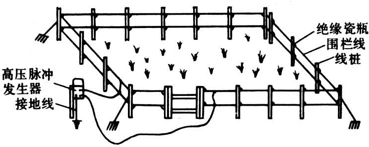 高压脉冲发生器的种类较多,早期有摆盘式、点火线圈式、振子式等。20世纪90年代已为晶体管和可控硅脉冲发生器所代替,利用可控硅交替地导通与关断,使高压变压器次级线圈上产生所需的高压脉冲电压。围栏线采用直径为4~5毫米的镀锌铁线,架设在瓷瓶上。线桩可用角钢、木材或钢筋混凝土等材料制成,长1~2米,埋深为桩长的1/3,桩间距离15~25米。绝缘瓷瓶可选用3千伏架空线用瓷瓶。围栏线的列数和高度由所围牲畜种类而定,一般上层线高度约为牲畜体高的2/3~3/4,下层线高度约为牲畜体高的1/3~1/2。牛、马群架双列,上层线高1米,下层线高0.5米;绵羊群架双列,上层线高0.8米,下层线高0.4米;山羊群架三列,第一列高0.8米,第二列高0.5米,第三列高0.25米;猪群架双列,上层高0.5米,下层高0.25米。围栏所圈形状为长方形,长宽比为2∶1、3∶1或5∶1。