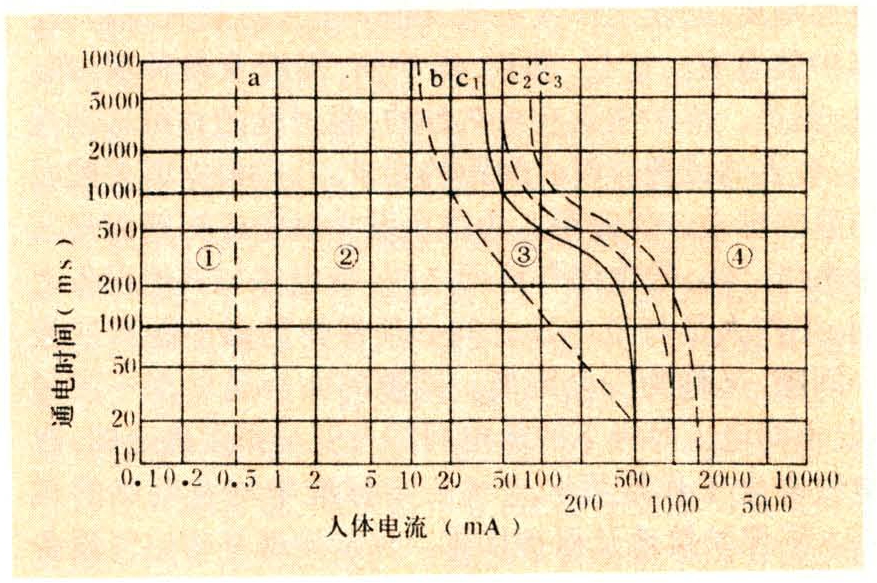 式中 I为心室纤颤电流(毫安);t为通电时间(秒)。此式允许时间范围为0.08~5秒。国际电工委员会(IEC)在1984年的479-1报告中提出了(经过修正的)人体通过15~100赫交流电流的时间/电流反应区,如图所示。图中所示交流电流对于人体的作用,按效应大小和通过电流的时间与其大小的关系,划分为四个区域。各区域中,交流电流对人体产生的生理效应为:1区通常无反应;2区通常无有害的病理反应;3区预计通常无器质性损伤,可引起肌肉痉挛,呼吸困难,对心脏搏动的形成和传导产生可逆性紊乱。随着电流量的加大,时间的延长,可能出现包括发生心房纤颤和非心室纤颤的瞬间停跳。4区除有3区的效应外,心室纤颤可能提高到5%(曲线C2)、50%(曲线C3)以及超过50%(曲线C3以外)。随着电流的加大,时间的延长,可能产生心脏停跳,呼吸停止,以及严重的烧伤等病理效应。②心脏搏动周期中,只有相应于心电图T波这一个特定相位对电流最敏感,通电时间越长,与该相位重合的可能性也就越大。③随着通电时间的延长,人体电阻因出汗等原因而降低,导致通过人体的电流进一步增加。