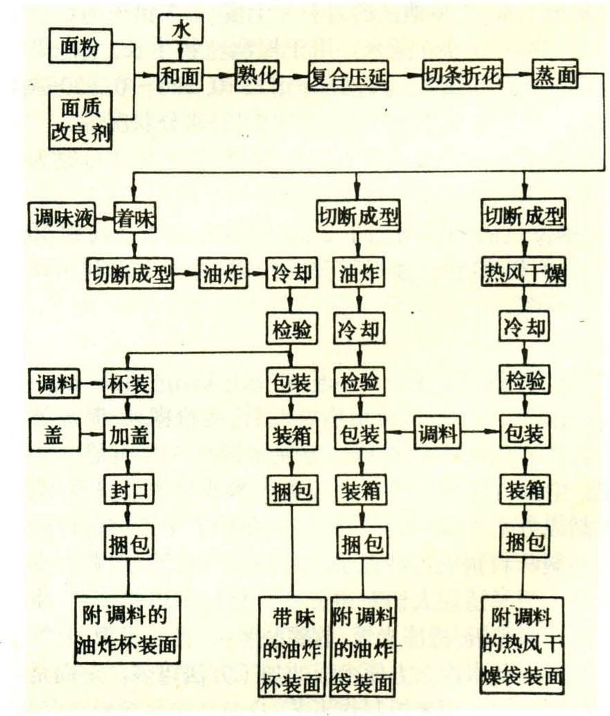 面粉与水等原辅料经和面、压延、切条折花、蒸面、干燥或油炸等工序,制成便于食用的干熟面条的生产过程。方便面又称快餐面或速煮面,是用沸水泡3~5分钟,或煮1~2分钟,加入调味汤料(调料)就可食用的面条。方便面主要有两类,热风干燥方便面与油炸方便面。包装方法主要有袋装、杯装和碗装,袋中均附有小包装的调料。根据调料的风味不同,又可分为中国风味、日本风味和欧洲风味等的方便面。