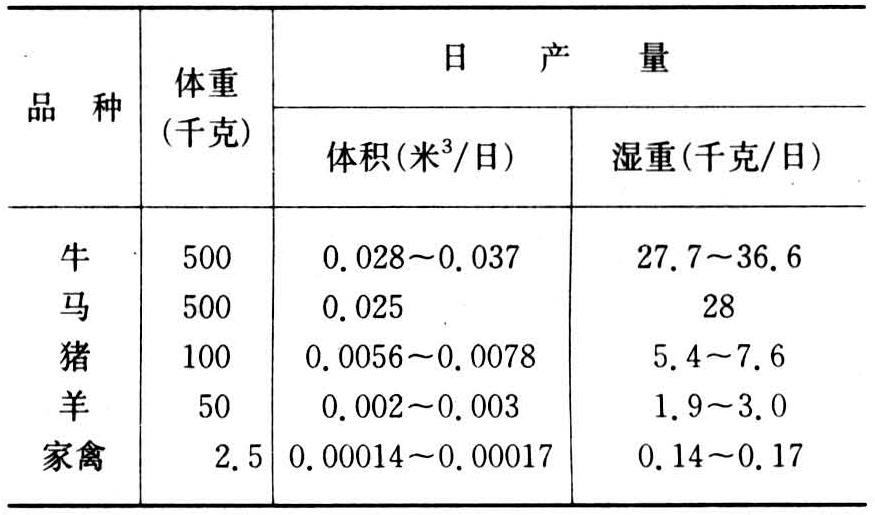 各类粪便的成分由其食料不同而有较大的差别。食草类动物粪便的碳素(C)含量高,氮素(N)含量低。如马、牛、羊粪便的C∶N为25∶1,吃饲料的猪粪便C∶N为13∶1,人粪C∶N为2.9∶1。粪便量的多少随各类动物品种体形大小而异(表1)。粪、尿比例差别也很大,猪粪和尿的重量约各占一半,牛粪是其尿重量的25倍,禽类的粪尿不分。
