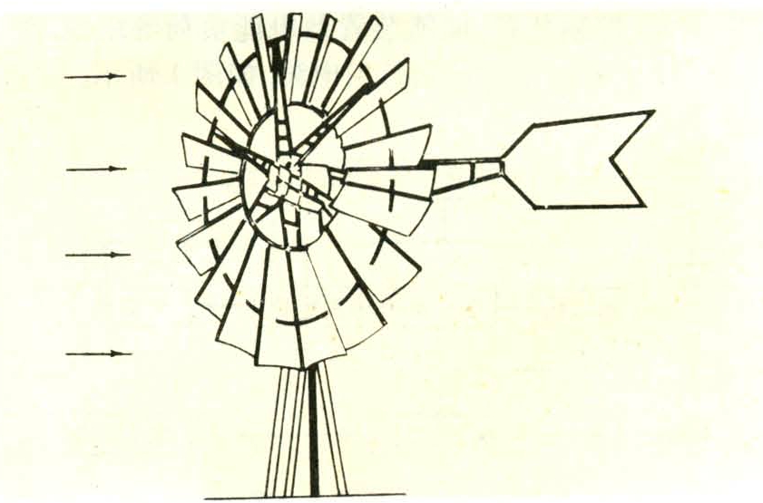 一台水平轴型风力机由风翼、调向装置、调速装置、变速器和固定机架组成,垂直型风力机可简化或不用调向装置。