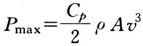 式中 Pmax为风轮可产生的最大功率(瓦);ρ为空气密度(千克/米3);A为风轮截面积(米2);v为风速(米/秒);Cp为功率系数,最大值Cp(max)=0.593,实际风力机的功率系数都低于此值。