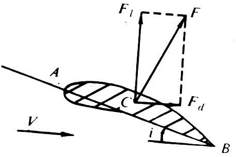 风轮是吸收风能后旋转产生功的部件。它是由一定数量和一定长度的风翼组成的。风轮旋转是由于气流通过翼面时,翼上部的风速比下部快,因而上部压力低于下部压力,产生了力F(图3)。F可分解为垂直于气流的分力Fe和平行于气流的分力Fd。Fe为升力,使风翼旋转运动。Fd为阻力。因此,风翼的断面形状和迎角i(翼弦与风向的夹角)对风轮的运动有很大影响。