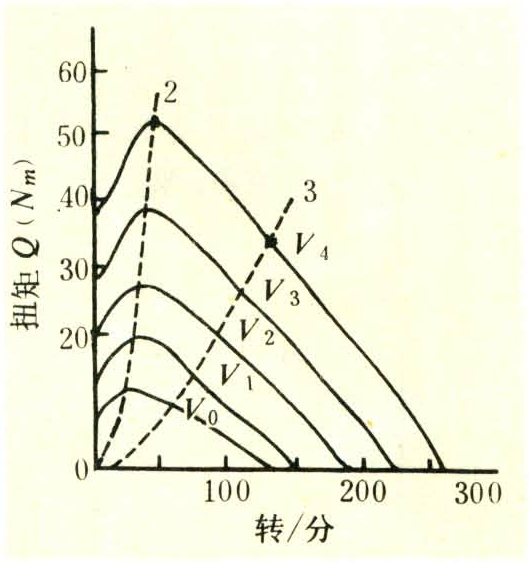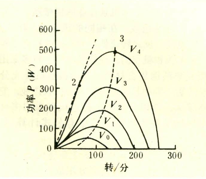 由图可知:①最大功率随风速增加而增加,如图5上的虚线3所示。②最大扭矩随风速增加而增加,如图6上的虚线2所示。③同一风速下风机最大扭矩时的风翼转速将低于最大功率时风翼的转速,如图5上风速为v4时的3点和2点。2点为最大扭矩的点,即此曲线上所得最大斜率的点。功率、扭矩和转速之间将有如下的关系: