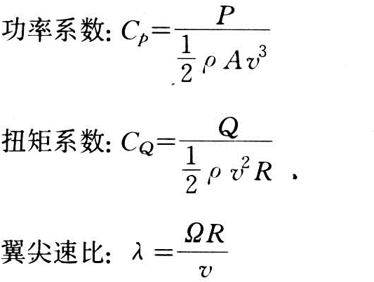 不同风力机的动力特性曲线必将随着风速(v)、风轮半径(R),甚至空气密度(ρ)的不同而变化。为了解不同尺寸的风轮在不同风速下的变化特性。人们将功率、扭矩和速度都化为下列无量网表达式: