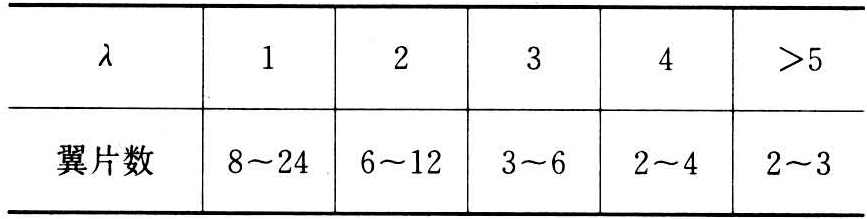 在实践中,根据翼尖速比,风力机可采用的翼片数目如下: