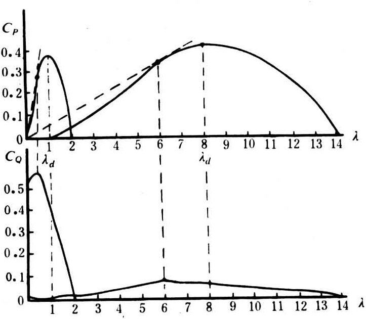 λ是确定各类风力机的一个重要参数。计算出不同风力机在不同风速下的λ值和功率系数CP值和扭矩系数CQ值,便可绘制成CP-λ关系的特性曲线,和CQ-λ的关系的特性曲线。图6是一台低速风力机(设计λd=1)和一台高速风力机(设计λd=8)CP和CQ随λ的变化的特性曲线。图上清楚表明,它们最大功率系数相差不大,但无论起动扭矩,还是最大扭矩都有明显差别。