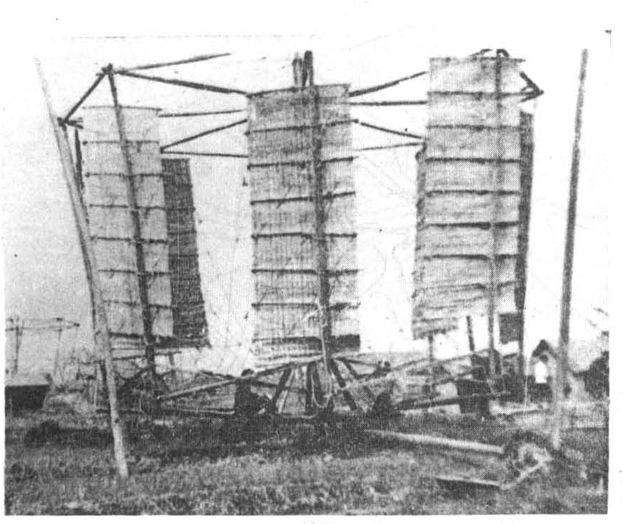 简单的斜杆式风车由6~8个布篷构成的风轮、传动装置、支架和提水机具几部分组成。风车的转速和功率可根据风力的大小,改变布篷的数目或受风面积加以调节。八帆风车是中国的独特创造(见图),其风轮由8个垂直放置的风帆构成。风帆分别偏侧安装在8个木质立杆上。每一风帆都可以立杆为中心转动,风帆在风力作用下绕垂直轴旋转,风轮通过装在风车下部的齿轮带动水车提水。这种风车不受风向的影响。风轮在风力作用下旋转时,能使帆面正面自动对风,当帆面背向风面时又与风向平行,以减少风帆阻力,因此它可以接受任何方向的风力作用,省略了一般风轮需要的对风装置,并通过绳索的作用,能调节风帆的迎风面积,控制风车的转速和功率,使风车得到保护。