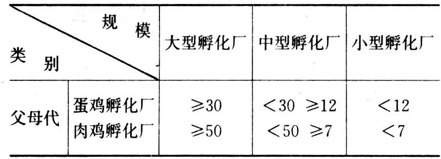 从事种蛋孵化,提供雏鸡的专用建筑物。小型孵化厅多与鸡场建在一起,大、中型孵化厂均单独兴建,成为专业化企业。中国的孵化厂分为大、中、小三种类型,建筑规模见表1。孵化厂(厅)既要与产蛋鸡舍接近,又要距离鸡场生产区有一定距离,一般建在场区夏季主导风向的下风向或侧风向处,距离鸡舍50米以上,并用围墙或绿化带隔离。独立的孵化厂建在场区外,与鸡场保持足够的防疫距离。