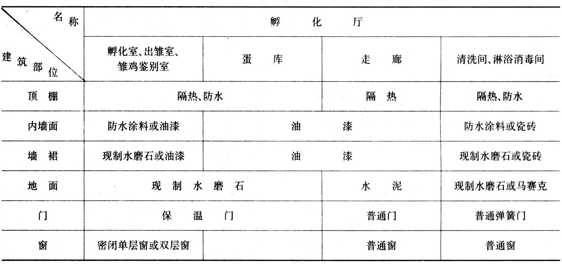表2 孵化厅主要建筑部位的材料与做法要求