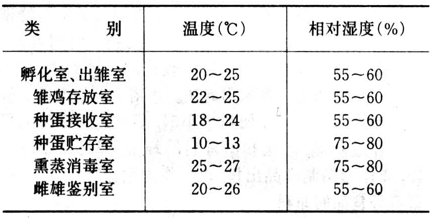 表3 孵化厅各室的温、湿度标准