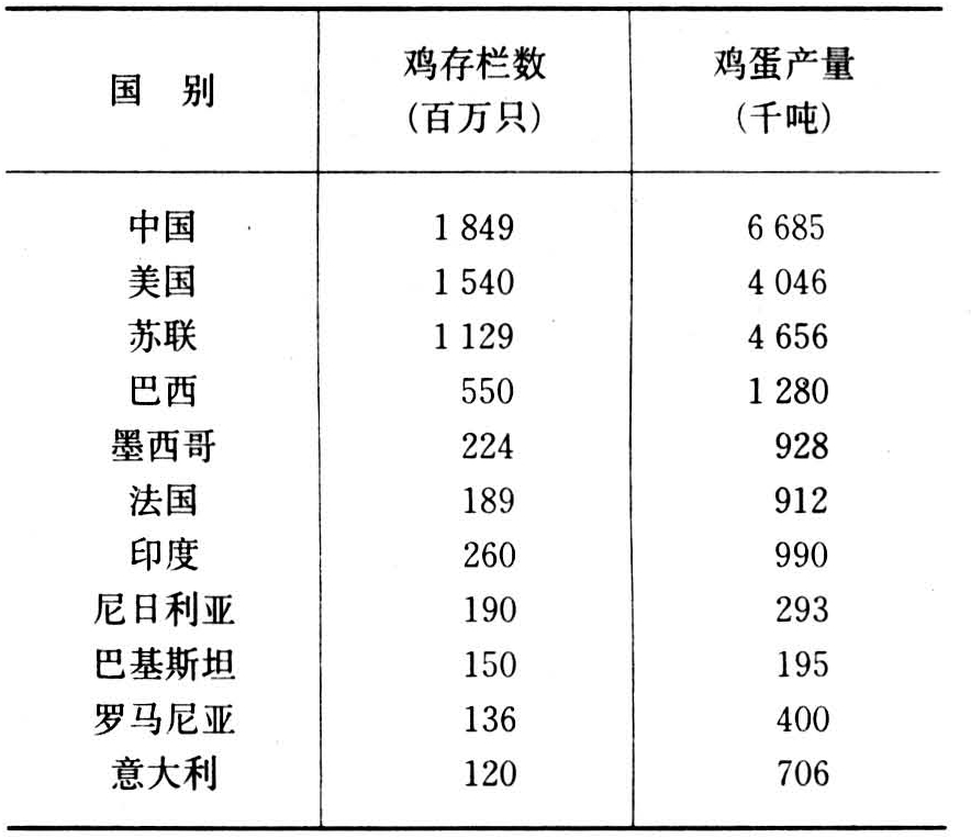 鸡的驯化,在中国至少有3000年的历史。鸡的饲养,在一个很长的历史时期内,主要是农户副业。随着科学技术和商品经济的发展以及人们生活需求的日益增长,逐步发展到大规模集约化和专业化生产,生产水平也大幅度提高。发达国家,20世纪40年代开始笼养,50年代出现机械化养鸡场,70年代以来机械化自动化程度愈来愈高,规模亦愈来愈大。中国1965年在上海建造了第一座工厂化养鸡场——红旗养鸡场。80年代全国许多地方纷纷建成了工厂化养鸡场。1988年世界各主要国家鸡存栏数和鸡蛋产量见表1。