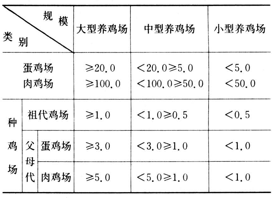 工厂化养鸡场按生产目的和用途,可分为种鸡场、商品蛋鸡场和商品肉鸡场。种鸡场主要是繁殖和培育良种,并供应优良品种的种蛋、种雏。根据育种配套系的利用情况,可分为:曾祖代(GGP)种鸡场;祖代(GP)种鸡场;父母代(PS)种鸡场。根据经济用途又可分为蛋用型和肉用型两类种鸡场。工厂化养鸡场按生产规模可分为大型、中型和小型三种。中国工厂化养鸡场生产规模分类见表2。