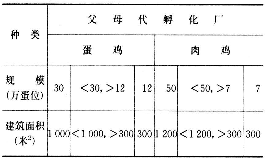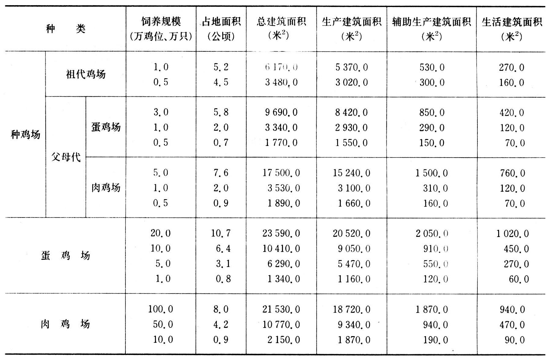 总体布置还应节约用地,尽可能紧凑。中国工厂化养鸡场的占地面积,各类建筑面积及孵化厂(厅)建筑面积见表5、表6。发达国家鸡场布置较紧凑,占地面积和建筑面积一般都低于中国。
