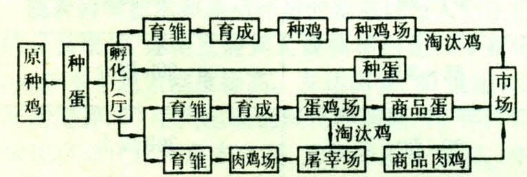 蛋鸡饲养工艺分三阶段(育雏、育成、成鸡)和两阶段(育雏育成、成鸡)两种;肉鸡饲养分两阶段(育雏、肉鸡)和一阶段饲养两种,一般多采用一阶段饲养,不再转群。饲养方式通常采用平养和笼养两种(见鸡舍)。各类鸡场饲养工艺流程见图。