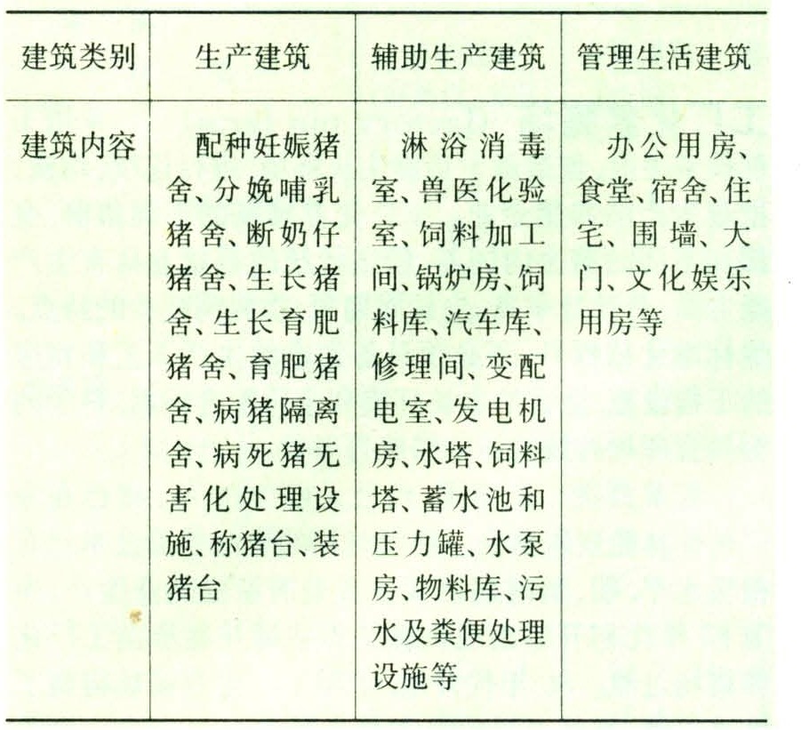 工厂化养猪场通常由生产建筑、辅助生产建筑、管理、生活建筑三部分组成。生产建筑是工厂化养猪场的主体部分,三部分建筑内容如表1所示。但不同地区和不同类型、规模的工厂化养猪场在房屋建筑、机械设备、环境控制手段等方面标准相差悬殊。管理生活建筑中的办公、宿舍、住宅、文化娱乐用房等设置数量和标准亦有较大差别。