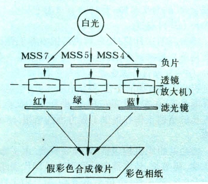分为假彩色合成和近似真彩色合成,均可在放大机上实现。假彩色合成又叫多软片法,即给摄影目标的不同谱段的黑白正片或负片加上特定的滤光镜,通过光学系统使它们的影像精确地重叠在一起,投影在屏幕上或放大机的承影板上,形成摄影目标的彩色影像。美国陆地卫星多谱段扫描仪在0.5~0.6(MSS4)、0.6~0.7(MSS5)、0.7~0.8(MSS6)、0.8~1.1(MSS7)微米四个谱段扫描地球表面的景物,得到同一景物的四张黑白图像。根据光的三原色原理,如图1所示,用MSS4、MSS5、MSS7的黑白负片分别加上蓝、绿、红滤色镜,使它们的影像精确重叠并感光在彩色相纸的三层感色乳剂上,经摄影处理便得到一张假彩色合成像片。