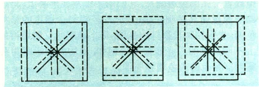 在遥感图像中,边界是区分一类地物与另一类地物的分界线。这种分界线是密度发生突变的地方,增强边界有助于提高解译图像的准确度,如识别地壳运动造成的断裂构造格局。用光学方法实现遥感图像的边界增强是比较简单易行的,把遥感图像的正片和负片精确叠合在一起之后再让它们沿某一方向彼此移动一个微小的距离,在影像密度突变的地方就会出现边界增强现象,如果把这种处理的结果感光在相纸上并经过摄影处理,就能得到一张增强了边界的图像。边界增强的效果受边界密度梯度大小影响,如果在处理之前先对遥感图像施行反差增强处理,使边界有较大的密度梯度,就能获得更理想的结果。另外,在同一次增强处理中,不同方向的边界的增强效果是不相同的。如图3所示,与移动方向平行的边界或某段边界,由于它们在最大密度梯度方向上没有相对位移,故未得到增强;与位移方向垂直的边界或某段边界,沿最大密度梯度方向有最大允许的位移,于是得到最明显的增强;那些与位移方向斜交的边界,则随交角的大小而得到不同程度的增强。