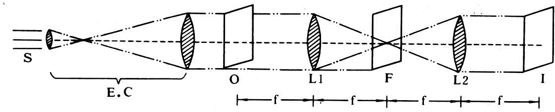 光学透镜本身具有傅立叶变换性质,能把一个波形分解成许多不同频率的正弦波之和,如果这些正弦波加起来成为原来的波形,就确定了这个波形的傅立叶变换。傅立叶变换的图形表示就是一张显示每个被确定正弦波的振幅和频率的图。遥感图像上的物体是由密度体现的,通过透镜之后,在透镜的焦平面上产生一个空间频谱图,密度变化大的区域(图像上物体细节部分),空间频率高,对应于频谱图中的高频部分,反之亦然。密度均匀无变化的区域,空间频率为零,对应于频谱图中的零谱。改变频谱,对原图像进行处理,再经傅立叶逆变换,可得到一幅增强了所需信息的新的图像。根据这个性质,可制成频谱分析、光学滤波和光学相干等光学图像处理装置。图4是4f相干光处理装置的光路图,He-Ne激光器S发出的单色光经扩束-准直系统E.C处理后照明待处理的原始透明图像O,O位于透镜L1的前焦平面处。可以把图像看成由许多细节组成,细节越细,其空间频率越高;细节越粗,其空间频率越低;图像中的连续背景则对应于零频。透镜L1进行傅立叶变换,在它的后焦平面(变换平面)F上形成傅立叶频谱:零频位于中心,由中心向外依次是低频、高频。透镜L2的前焦平面与L1的后焦平面重合,经L2再进行一次傅立叶变换,在它的后焦平面上的傅立叶频谱便综合成一幅与原始图像方向颠倒的新图像。这个新图像可以用肉眼观察,也可以用照像方法记录下来。只要在变换平面F处放入不同的滤频片、光栅,或者把单色光改为白光,就能得到不同的处理结果:或者原始图像中很不明显的细节、边界得到了增强,或者消除了原始图像中的噪音、条纹,或者某一方向的图像得到了增强,或者改变了原始图像的反差,或者原始的黑白图像变成了彩色图像,等等。