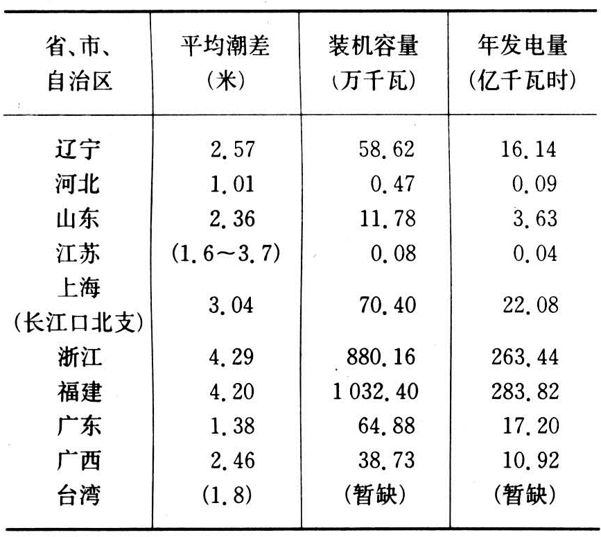 天体运动引起海水周期性垂直涨落所具有的势能。潮汐主要是由于月球对地球的引力,其次是太阳的引力而产生,其大小和类型还与地理位置、地形以及水量分布有关。中国的沿海潮汐主要是太平洋潮汐传入引起的,另外还有独立形成的潮汐。其类型和潮差分布比较复杂(见图),就世界范围而言,中国的潮差属中等,潮汐能资源理论蕴藏量为1.9亿千瓦,可开发利用的装机容量约为2000万千瓦,可开发的年发电量约为600亿千瓦时。福建和浙江两省占全国可开发利用的装机容量的88%,中国潮汐能资源分布情况见表1。由于中国海岸线曲折多湾,适合建造500千瓦以下装机容量潮汐发电站的站址较多,现有运行正常的潮汐电站15座,是世界上开发潮汐电站最多的国家。目前世界上最大的潮汐电站是法国的朗斯电站。潮汐动力站的主要原理是,在涨潮时把海水蓄在水库里,使水库水面和海面形成水位差推动水轮机旋转(见潮汐能发电)。