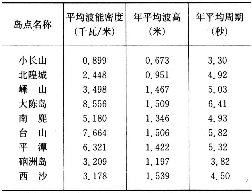 海水在外力作用下(主要是风力)产生波动所具有的能量。一般用波能密度表示大小。中国波浪能理论蕴藏量为1.5亿千瓦,平均波能密度小于10千瓦/米。由于中国海岸地形复杂多变,岸线较长约3.2万千米(包括海岛岸线),平均波能密度分布极不均衡,其分布状况见表2。中国的波浪能受南北季风及台风影响在一年中分布也极不平衡,连续稳定性差,平均波能密度较小,开发技术尚不成熟,影响波浪能的利用。