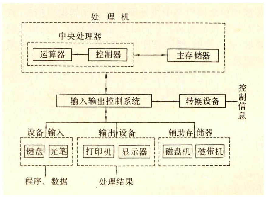 硬件系统主要由运算器、主存储器、控制器、输入设备和输出设备等组成(见图)。运算器完成数据的算术运算和逻辑运算。主存储器负责存储二进制信息(包括数据、程序和结果),并根据需要把二进制信息存进去或取出来。控制器是整个机器的指挥控制中心,它向机器的各部件发出控制信号,使各部件自动地、协调地进行工作,完成用户在程序中规定的任务。输入设备负责将用户的信息(包括数据和程序)变换成计算机能识别和处理的形式,有键盘、光笔、文字阅读机和扫描仪等。输出设备负责将计算机处理的结果变成用户所需要的形式,显示、打印、绘制或存储起来,有显示器、各类打印机、绘图仪、磁带机和磁盘机等;磁带机和磁盘机等又称辅助存储器,用来存储主存储器难以容纳、又为执行程序所需要的信息,它们的存储容量很大,存储成本低,但存储速度较慢。转换设备负责将模拟量变换为相应的数字量,输入计算机,或者将计算机输出的数字量变换为相应的模拟量,输出到控制对象中。转换设备有模/数转换器和数/模转换器。控制器和运算器构成中央处理器,中央处理器和主存储器构成主机(也称处理机),主机以外的部件称为外围设备。