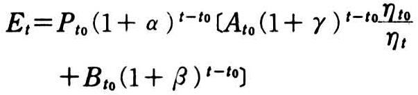 式中 Pt0、At0、Bt0分别表示基年时的人口数、人均年基本生活能源消费量和文明生活能源消费量;α、γ、β为预测年段(t-t0)期间相应的平均增长率;ηt0和ηt为基年t0和预测年t时基本生活用能综合转换效率。