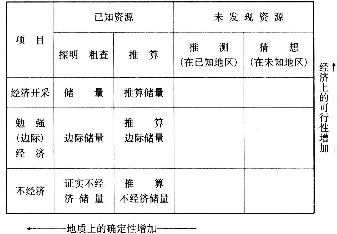 研究的主要问题是:①资源分类。一般采用两个参数:资源储量在地质上的确定程度和开采该种资源在经济上的可行程度。资源分类在国际上尚无统一公认的标准。但美国地质局使用的分类定义已为多数人熟悉和借鉴。如表1所示。