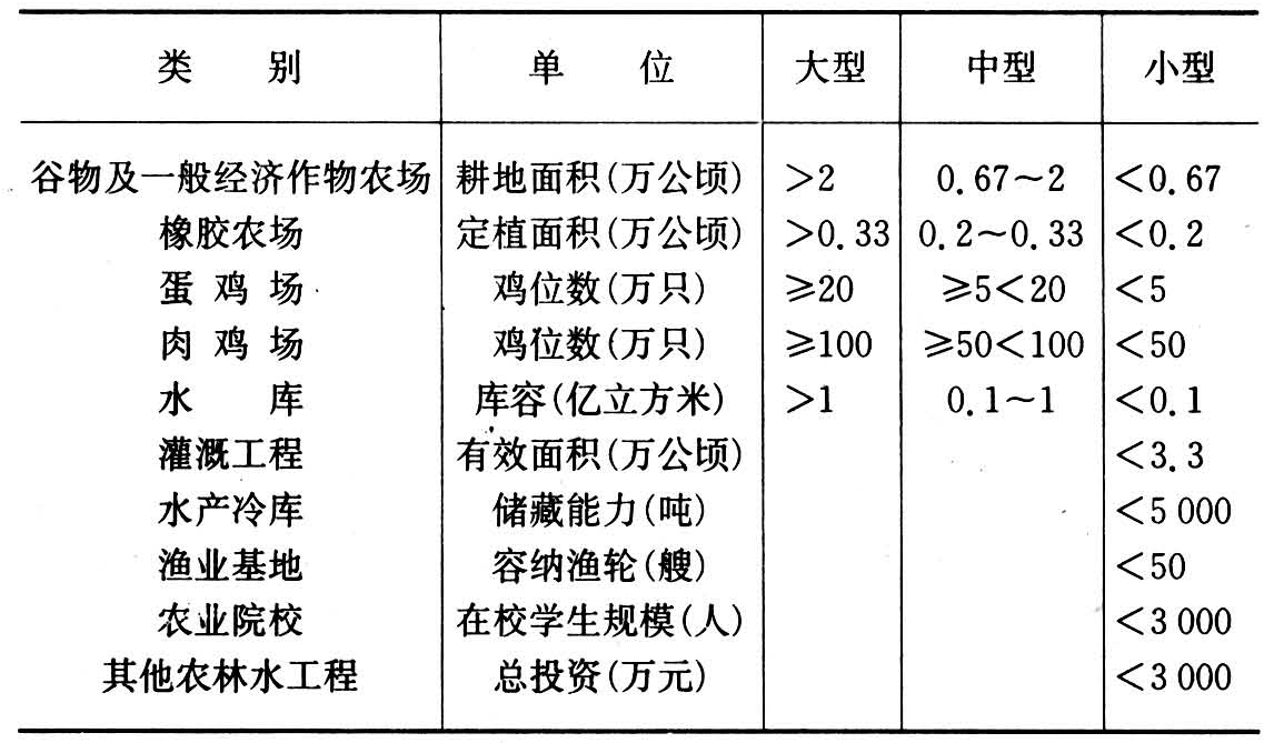 在中国,农业建设项目,按其性质分为新建工程项目、改扩建工程项目和续建工程项目。新建工程项目是指计划内,从无到有,从头开始建设的工程项目,或原有企业、事业单位进行扩建,其新增加的固定资产价值超过原有固定资产价值3倍以上的,应列为新建工程项目。改、扩建工程项目是指原有企业、事业单位,为了转变产品或增加新的效益(经济效益、社会效益、生态效益),或扩大主要产品的设计能力,在计划期内进行改建、扩建的工程项目,以及限额以下技术改造项目,单项工程新增建筑面积超过单项工程原有面积30%的也属改扩建工程项目。但对已有企业、事业单位进行较小的技术改造,单项工程新增建筑面积小于单项工程原有面积30%的,一般列为更新改造工程项目,不属于基本建设范围。续建工程是指过去年度已正式开工建设的项目(新建或扩建),中途曾停止建设,在计划期内又恢复投资建设的。但在继续建设时又进行扩建的,则作为续建的扩建工程项目对待。按照设计能力大小或总投资多少,拟建设的农业工程规模分为大型、中型、小型三种,以便于分级管理工程建设投资。新建工程项目按工程的全部设计能力或所需要的全部投资概算划分。改、扩建工程项目按新增的设计能力或改、扩建所需投资概算划分,不包括改、扩建前原有的生产能力或投资额。中国农业工程建设规模划分标准见下表。