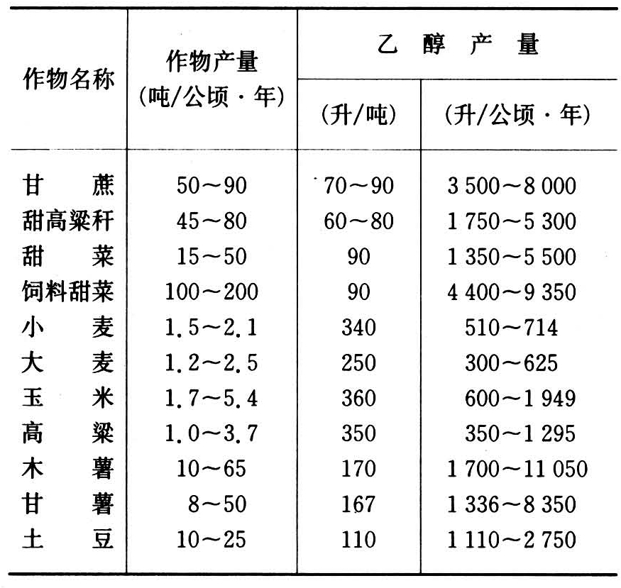 亦称燃料乙醇。以甘蔗、甜高粱秆、甜菜、木薯、土豆等农作物为原料制取。常用的农作物原料及乙醇的平均产量见表1。